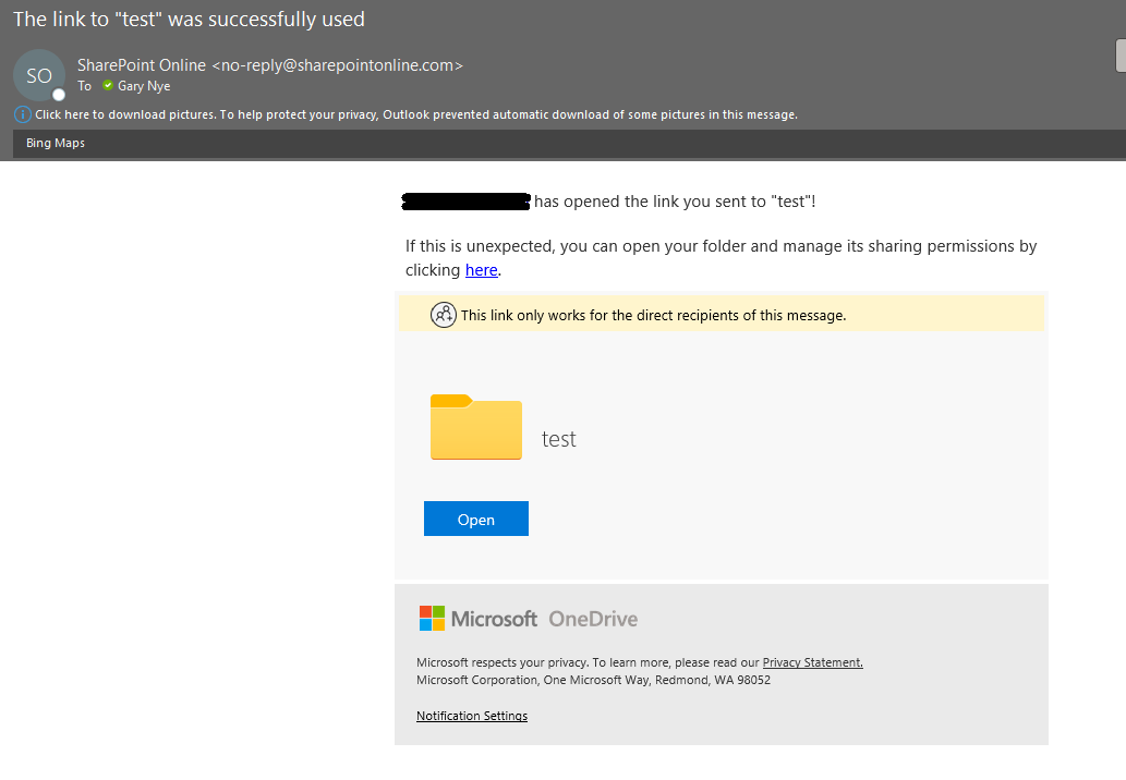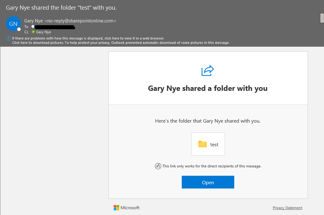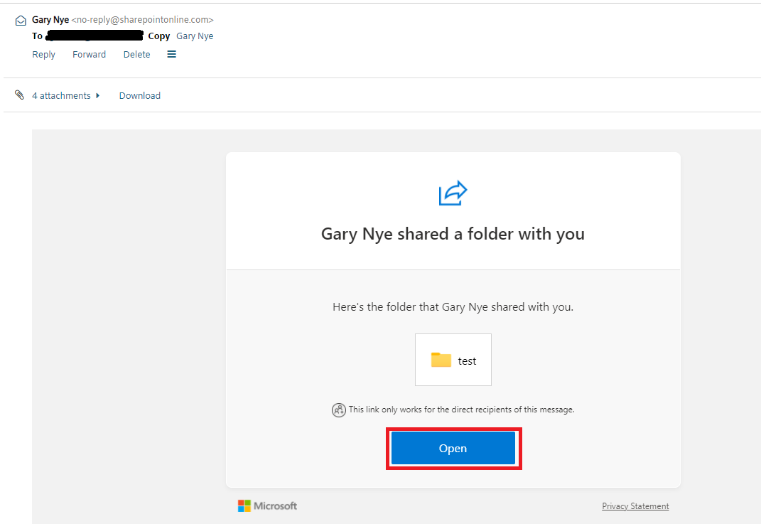 - The person you shared with will also receive an email, when they click on open, it will take them to your OneDrive where the file is located