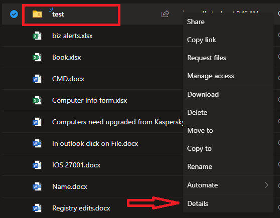 - Go to the file in OneDrive and click the 3 dots and select details in the drop down